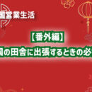 更新情報 コラム:「【番外編】中国の田舎に出張するときの必需品」を更新しました。 2025.09.25 今回は、中国の地方への出張をご予定の方に向けて、持参すると安心なアイテムをご紹介します。同じ中国でも、上海や北京といった大都市と、農村部では生活環境が大きく異なります。地方出張の際のご参考になれば幸いです。ぜひご一読ください。 2025.02.11 【番外編】中国の田舎に出張するときの必需品 你好! 新年快乐!(xin nian kuai le/シンニェンクァイラー/新年おめでとうございます!)中国では、1月28日に除夕(...