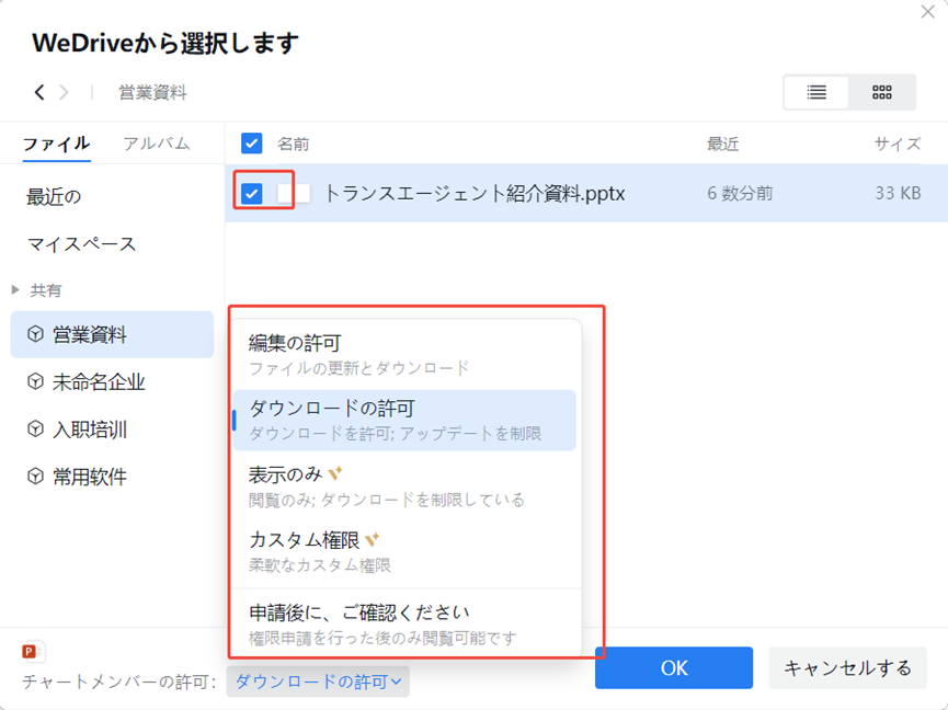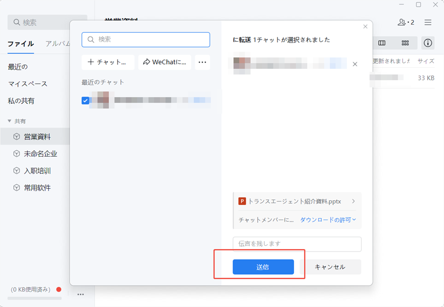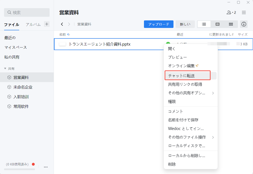 まずは、微盘(WeDrive)の画面でファイルを右クリックして「チャットに転送」を選びます。